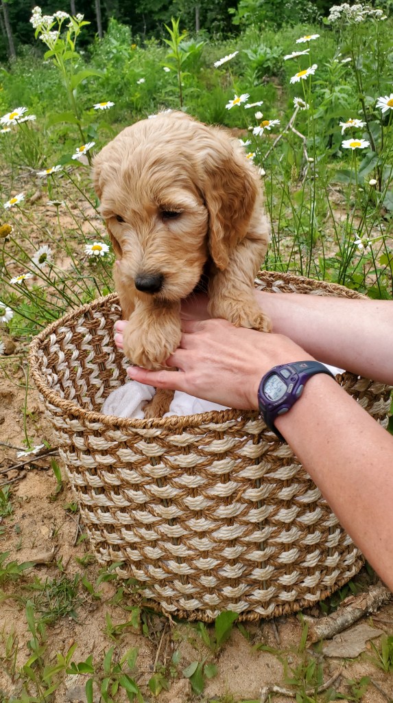 Pacha is 50% Poodle and 50% Golden Retriever. He’s the perfect, playful, family dog. Loves retrieving sticks and balls. Also loves swimming with us in the pond. He’s actually “rescued” me a few times, thinking I needed to be back on shore. Will grab my arm or float string, in the water, and pull me back to the land. Doesn’t like the roosters fighting and will break it up if he hears it. On more than one occasion, he’s trapped a runaway chick without hurting it, so that we could pick her up.