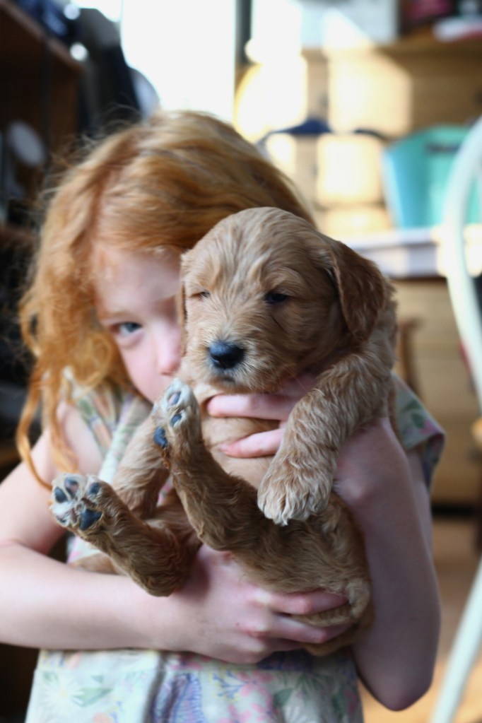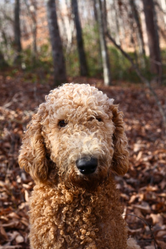 Maple is 75% poodle and 25% Golden Retriever. She is an excellent, healthy, attentive mother who has had 3 litters. 9, 12, and now 11! She loves to go for rides in the car. Makes a wonderful protector for our small farm. At about 6 months old, she began herding the chickens into their pen, on her own. Highly intelligent. Extremely easy to train and very intuitive. Has chased off a few foxes for us as well.